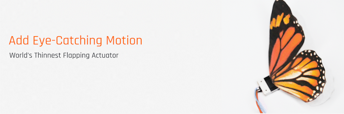 FlatFlap is the thinnest flapping actuator we've seen ~ just 0.3mm thin! This compact module can be used both as a flap or to add eye-catching motion to your projects, transforming them into unique pieces of art. Its easy to attach and comes with a color-changing sticker, to make your creations stand out! This FlatFlap actuator is intended for low- force applications, only managing to lift weights under 2 grams, using a simple on-off approach. But by increasing the operating frequency to resonate with the mass (between 3–25 Hz), you can amplify its lifting force and vibration speed. For smooth, organic motions, check out the examples provided in the DriveCell library.